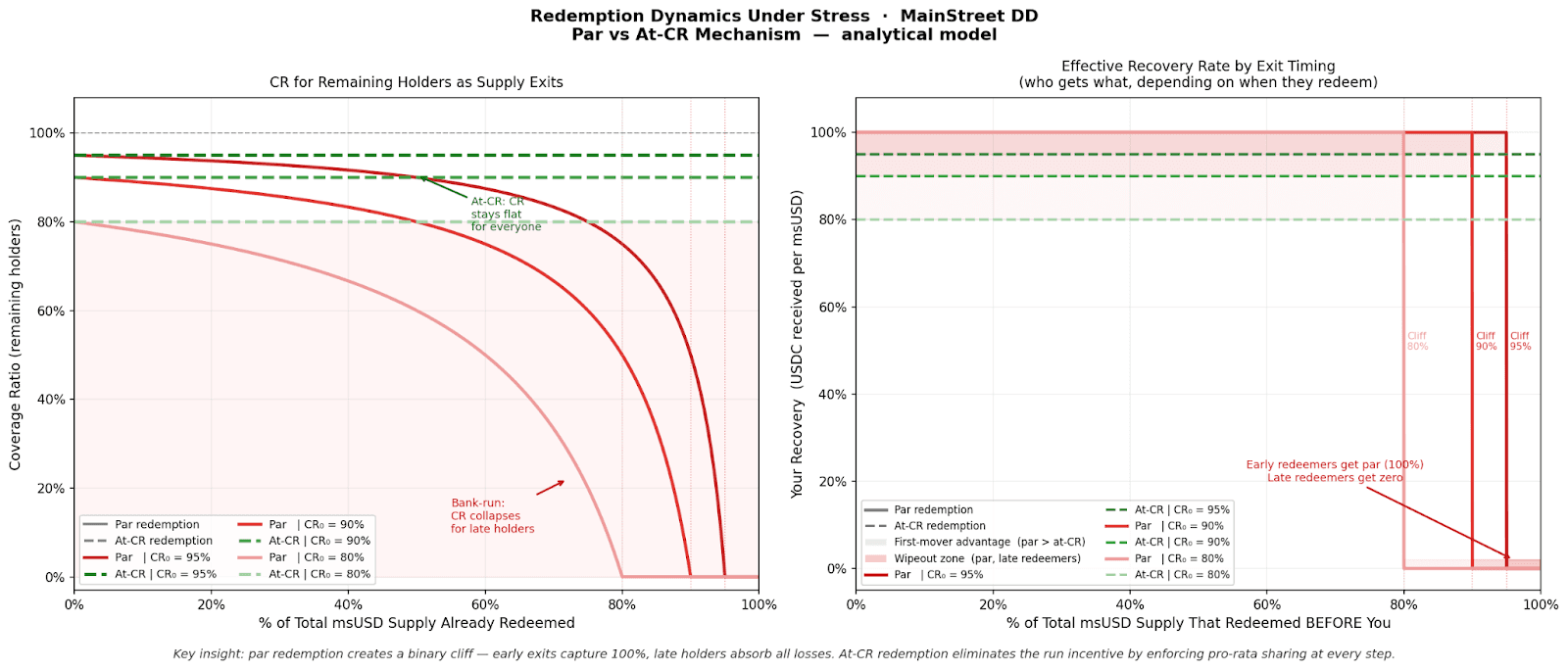 Overall, MainStreet can be characterized as a hybrid CeFi–DeFi yield infrastructure whose risk profile is driven less by smart contract risk and more by derivatives execution, margin dynamics, and redemption design under stress conditions. Continued transparency around leverage, coverage monitoring, clearing diversification, and redemption fairness mechanisms will be important factors in evaluating the protocol’s long-term resilience.