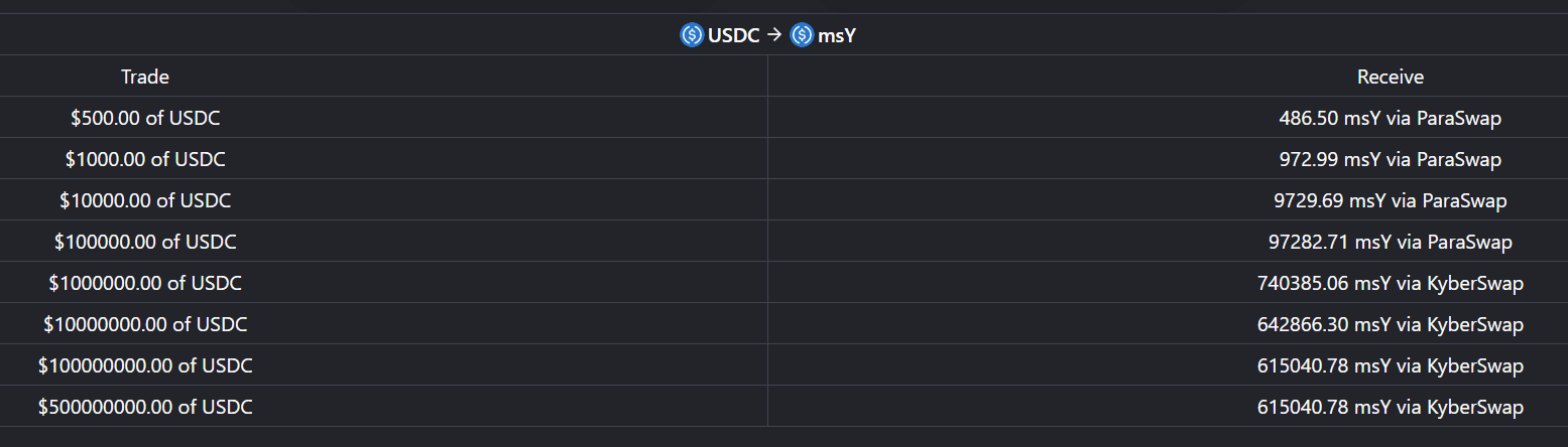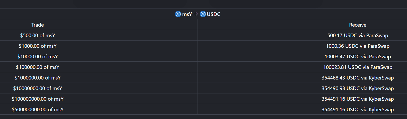 Large (> $1M): effective execution plateaus, selling $1M of msY returned ~$354k USDC in your snapshot; additional size beyond that did not materially increase received USDC (clear sign of depth exhaustion).