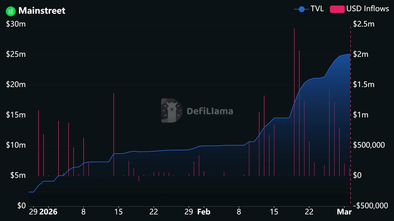 TVL expanded from roughly $7–8M to over $22M within ~6 weeks, with inflows appearing episodic and driven by large allocators rather than organic retail demand.Stable yield appears to be the primary adoption driver.