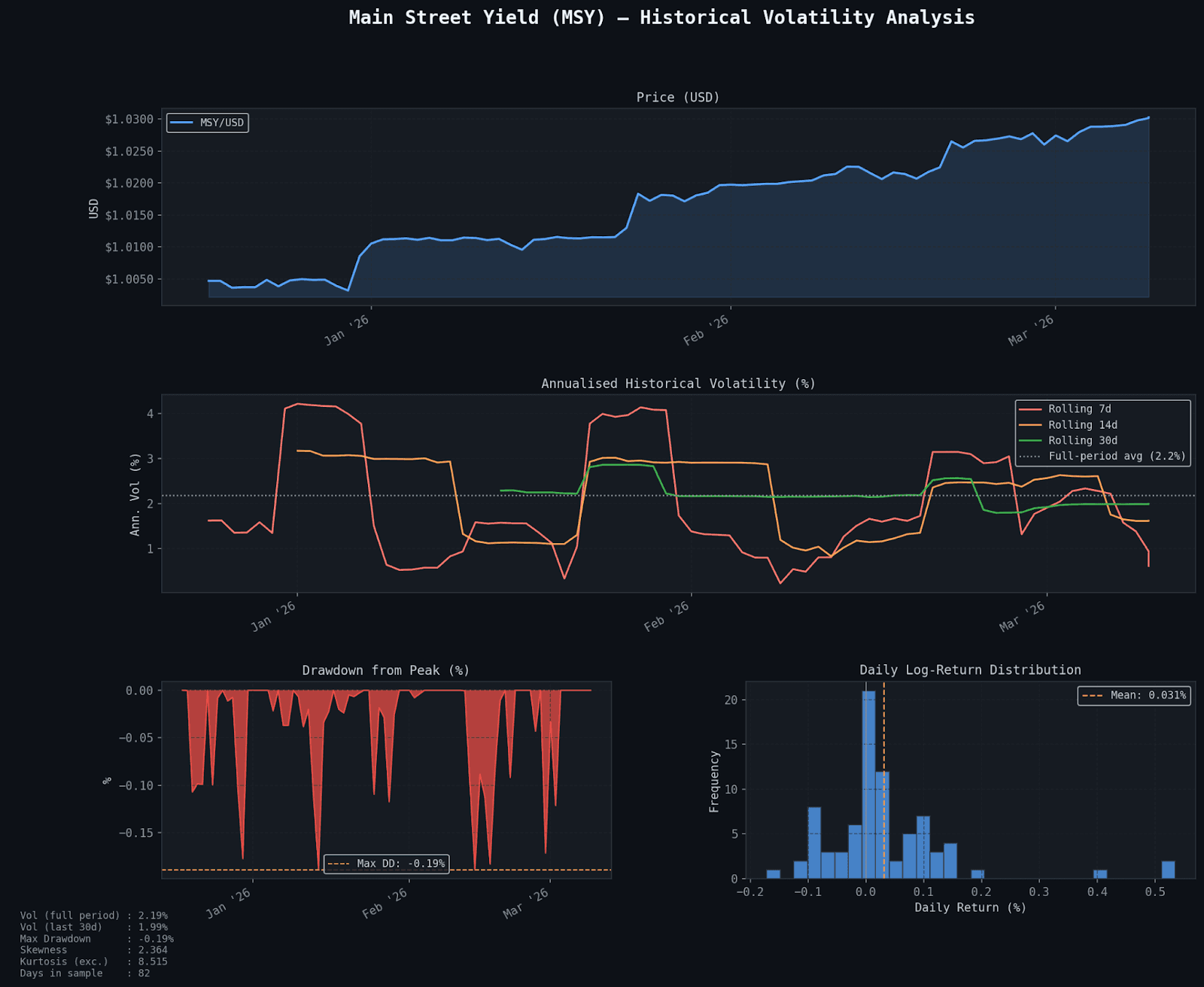 Historical price behavior for msY indicates a very low realized volatility profile relative to typical crypto assets, consistent with the characteristics expected from a derivatives-based financing strategy.
